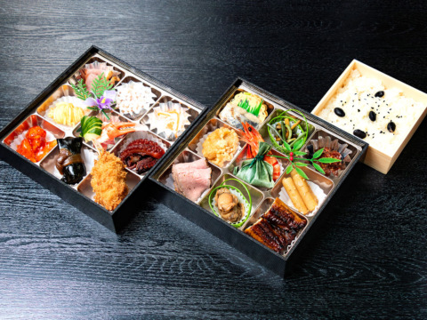 玉子焼/焼魚/山菜水煮/ナスグラタン/鳥竜田揚げ/有頭海老/笹フ団子/タタキゴボウ/ローストビーフ/帆立甘露煮/ウナギ焼
