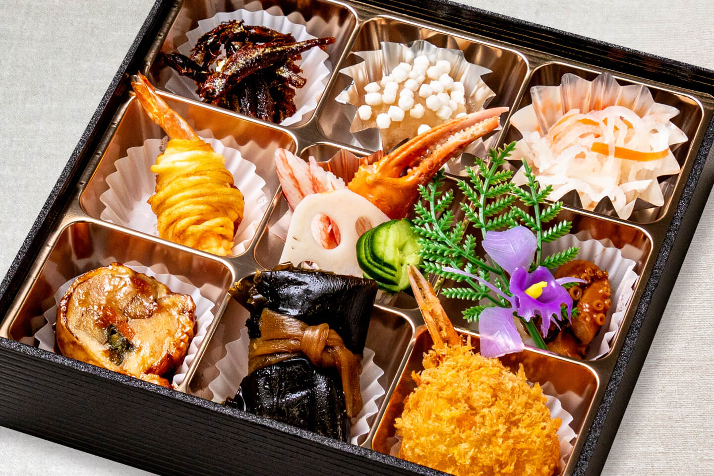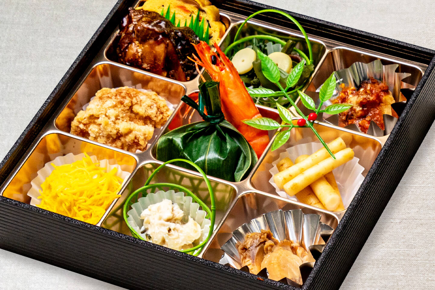 玉子焼/焼魚/山菜水煮/ナスグラタン/鳥竜田揚/有頭海老/笹フ団子/タタキゴボウ/錦糸シューマイ/山海漬/帆立甘露煮
