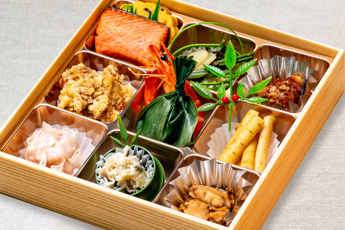 玉子焼/焼魚/山菜水煮/ナスグラタン/鳥竜田揚/有頭海老/笹フ団子/タタキごぼう/カニシューマイ/山海漬/ホタテ甘露煮